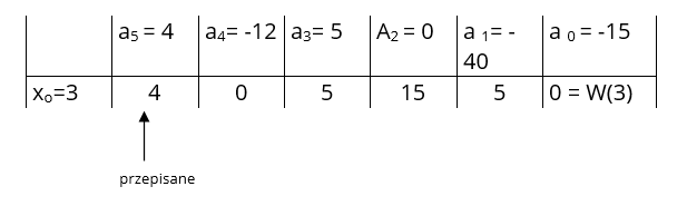 W (x) = 4x5 – 12 x4 + 5 x3 – 40 x – 15 , dla argumentu x = 3
