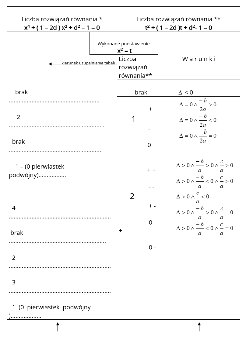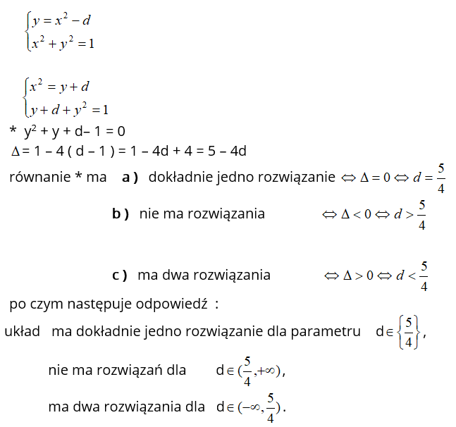 ** x4 + ( 1 – 2d) x2+ d2 – 1 = 0 i już wiedzą, że liczba rozwiązań układu *, zależy od liczby rozwiązań równania **. I tu pojawia się nowy problem: dyskusja liczby rozwiązań równania dwukwadratowego w zależności od parametru .