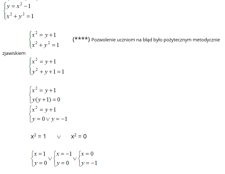 Aby sprowokować uczniów do dyskusji sugeruję , aby problemowi przyjrzeć się za pomocą metody graficznej . Proponuję rozpatrzyć układ dla a = 1 . Wtedy uczniowie widzą od razu , że parabola y = x2 – 1 przecina okrąg x2 + y2 = 1 w co najmniej trzech punktach :